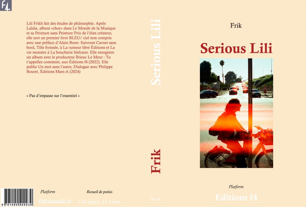 2024 : « Skarlet » Chansons électroniques. CD, Vinyle. Cassette. Textes et productions ouverts au public, 20 ans après : sortie Mai 2024 2022 : Lili Frikh & Brieuc Le Meur : « Tu t’appelles Comment ». Littérature audio. CD (il reste 8 exemplaires…) 2022 : Falling Felon, avec l’artiste Zambienne Apeg Lombé, par B… https://f4editions.bandcamp.com/album/tu-tappelles-comment ›